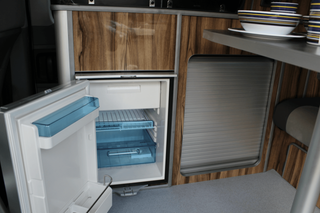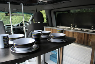 The good-sized Waeco fridge has 40litres of well-designed space, and a small compact freezer compartment. Flexibility is the key with the table layout. We provide a good sized, free-standing table with a tripod base which can be easily moved around inside the campervan, and can be used outside as well.